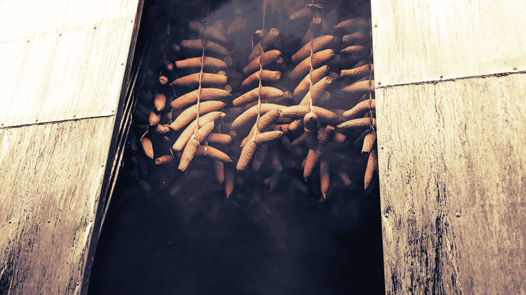 「ナラ」や「サクラ」など、広葉樹の原木を燃やし、2日以上昼夜を通して燻します。燻香を付け、漬けるのに最適な状態に水分を飛ばすためにも、最も重要で過酷な作業です。薪の管理だけでなく、均等に煙がいきわたる様に、燃やす位置も適宜変更します。