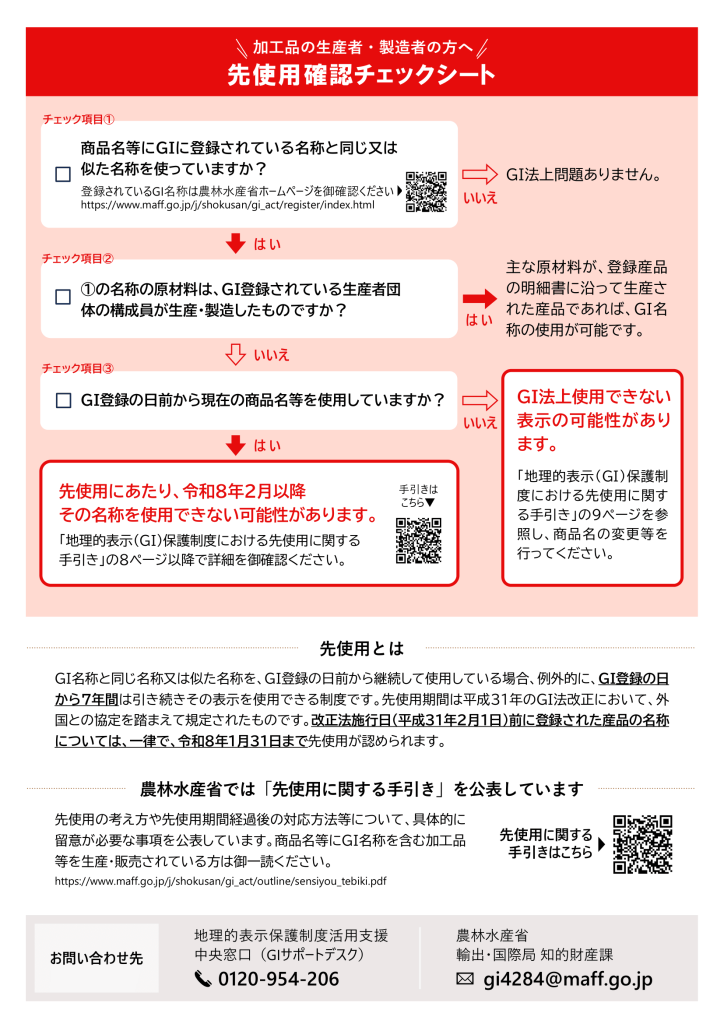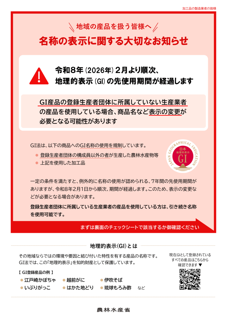 令和8年5月8日から「いぶりがっこ」先使用期間が終了するため、同産品を扱う皆様におかれましては、必要な準備を進めていただく必要があります。農林水産省では、「地理的表示(GI)保護制度における先使用に関する手引き」等の資料を公表していますので、対応にあたっての参考としてご活用ください。